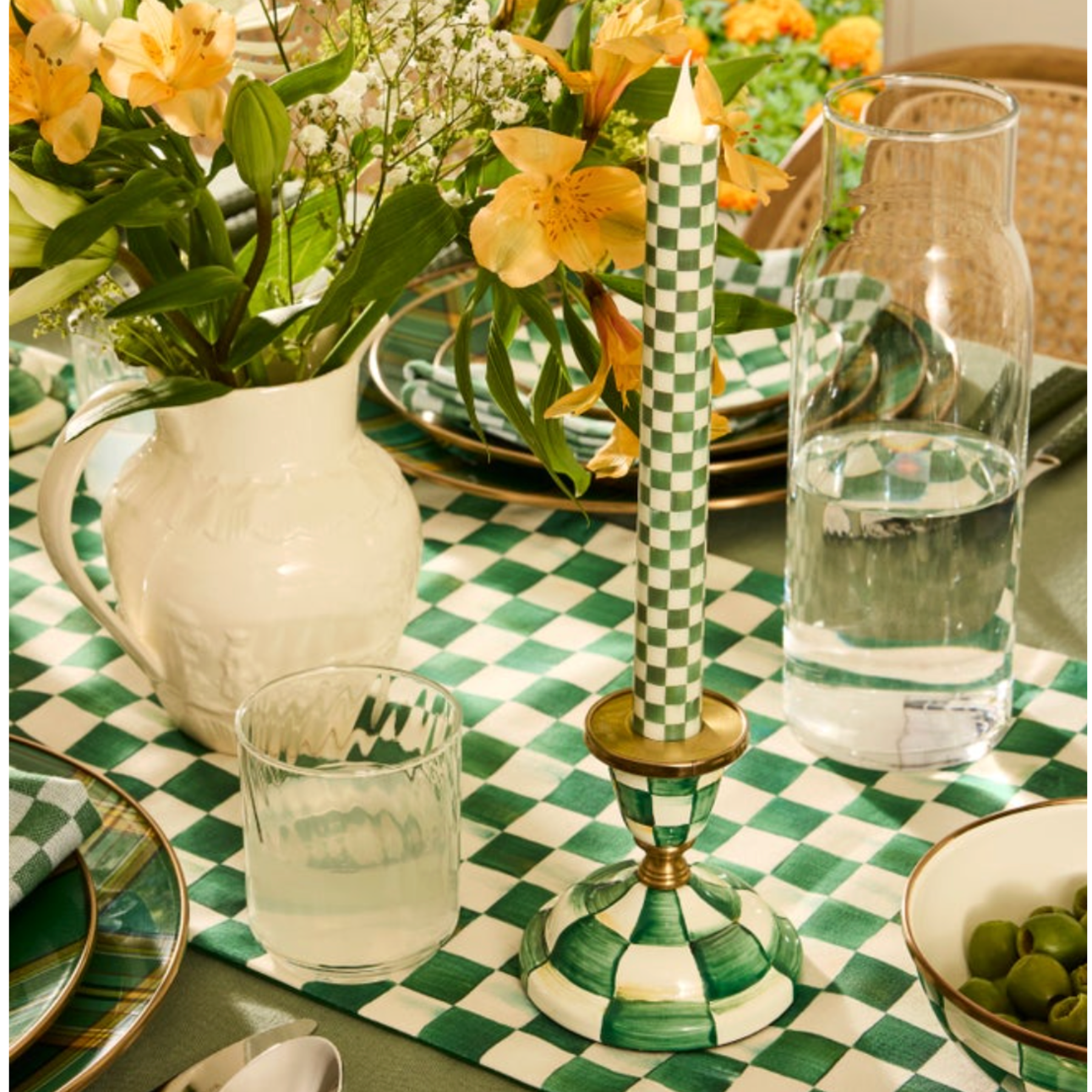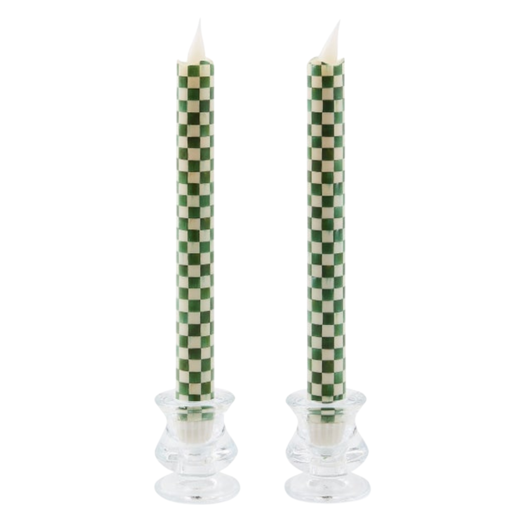 Every celebration can glow with MacKenzie-Childs style with this set of two Emerald Check Flameless Dinner Candles.
