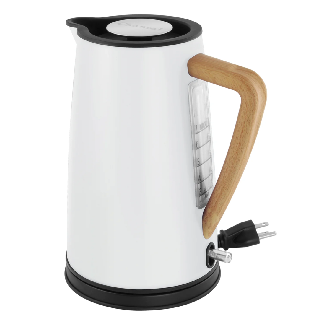 Central to Chantal's Scandinavian Collection, the 1.8-quart Oslo electric kettle blends clean lines with subtle Nordic elegance. Its modern silhouette is defined by a gently curved body and a handle with the look of natural blond wood, offering both style and comfort. A large, easy-to-read water level window allows for quick viewing without lifting the lid, while the lid and handle remain cool to the touch for safe, effortless handling.
