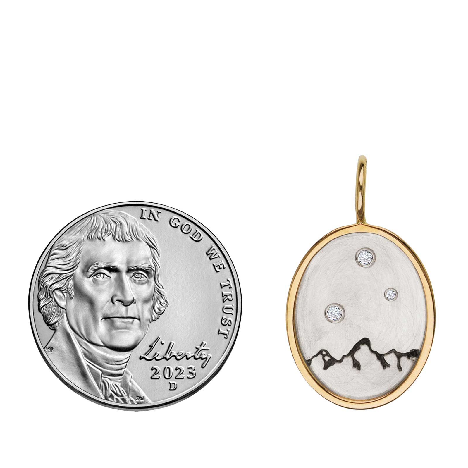 The Small Oval Gold Framed Silver Tetons Charm is a beautifully balanced piece that captures the elegance of mixed metals and the majesty of the mountains. A detailed Teton Mountain Range is hand-stamped onto a sterling silver oval, framed in radiant 14K yellow gold for a refined contrast.
