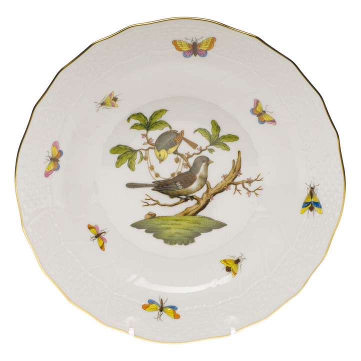 Rothschild Bird Brown Border is a lush design featuring the highly recognizable bird motif framed by tiny individually hand painted rich brown fish scales outlined in 24-karat gold. Many connoisseurs consider this pattern first created in 1860 for the Rothschild family of Europe to be the epitome of hand painting on porcelain. The smooth white porcelain body and hand painted designs invoke the passion of great sculptors and master painters in every piece manufactured for over 180 years by the Herend Porcelain Manufactory of Hungary.