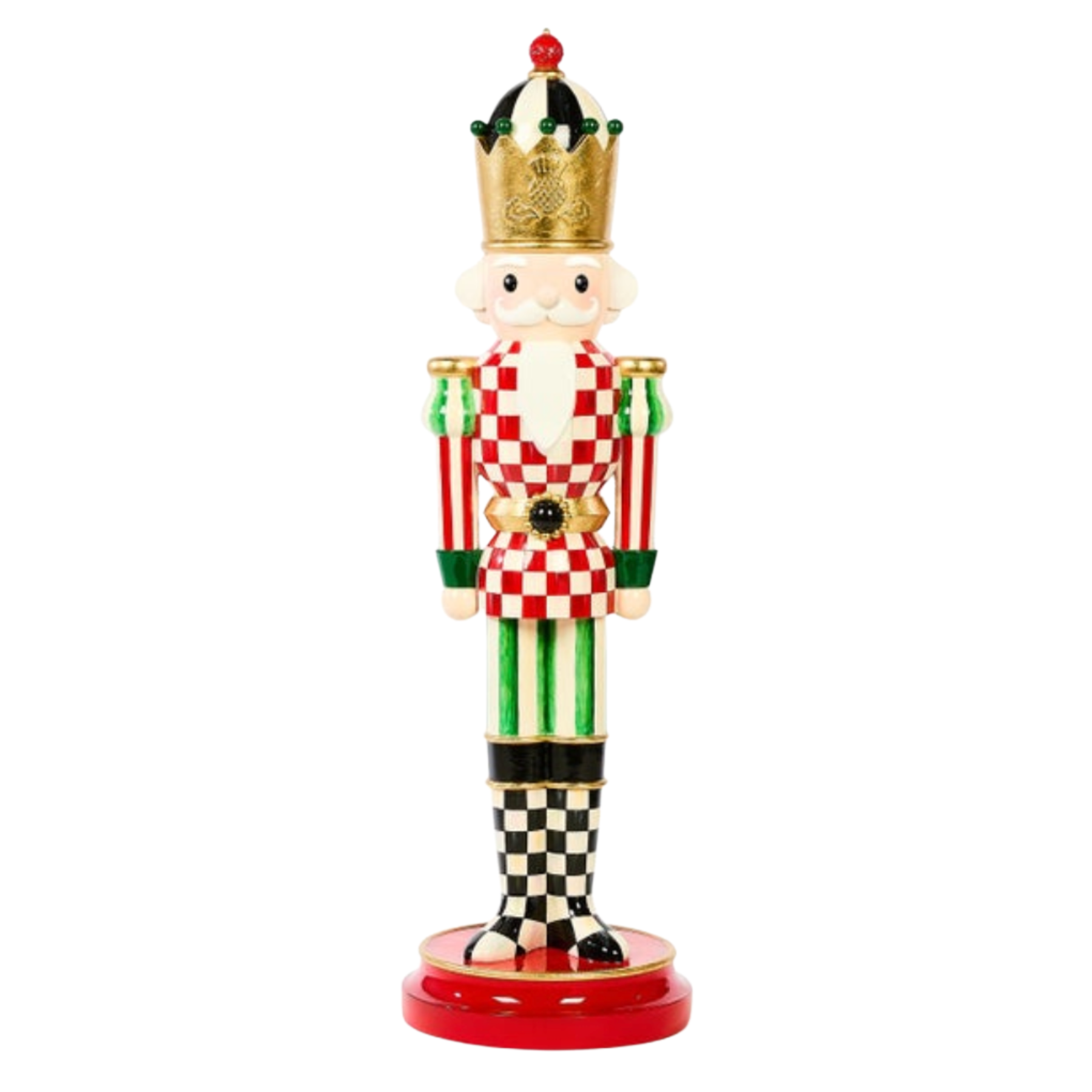 Add MacKenzie-Childs signature charm to your Christmas season with the Check It Out Small Trophy Nutcracker. This sweet nutcracker wears a stunning combination of patterns, alternating a Courtly and red checks, green stripes, and a crown topped by our iconic thistle logo.