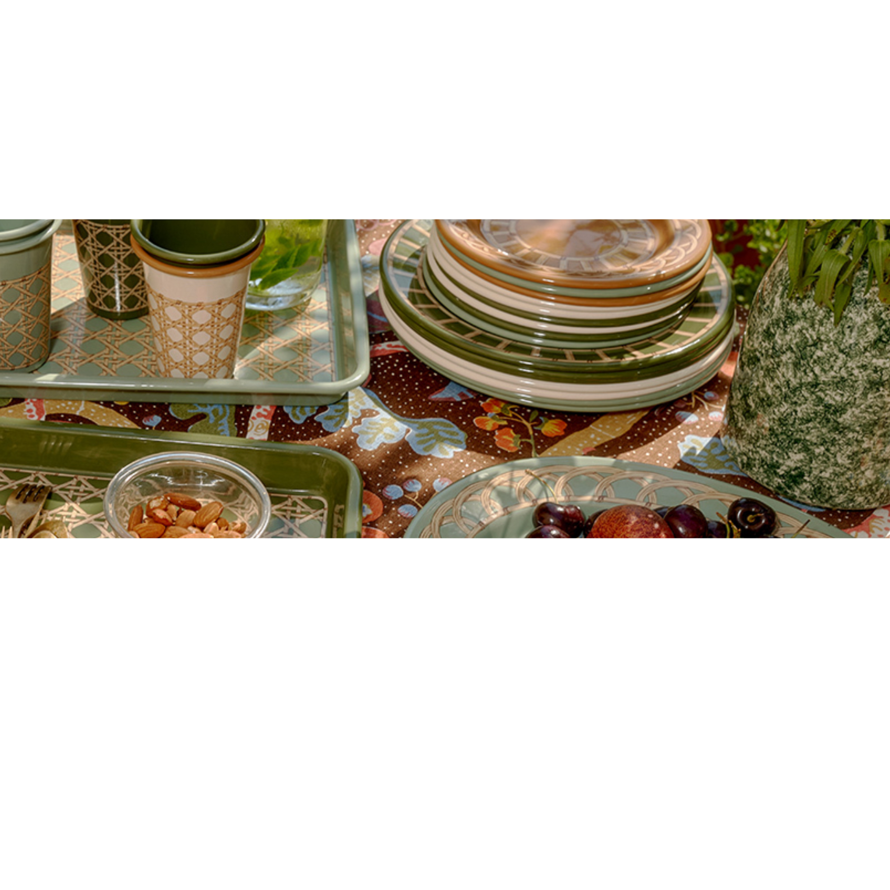 Designed by Kate Berry, this sophisticated enamelware collection brings her signature eclectic, colorful, and layered style to the table. Featuring on-trend wicker accents and a warm fall palette, the collection captures the essence of autumn while remaining timeless enough for year-round use.