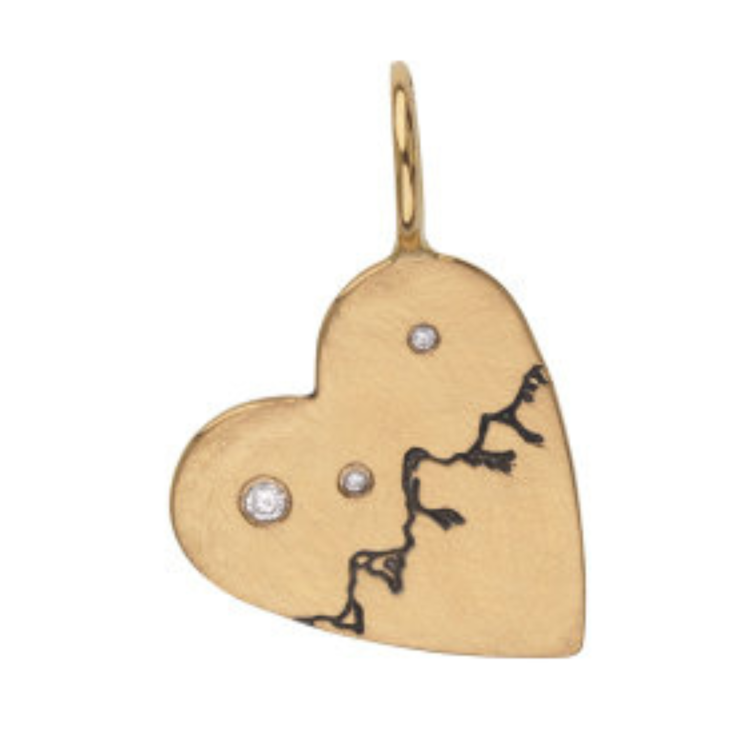 Handcrafted in 14K yellow gold, this petite heart-shaped charm is delicately hand-stamped with the iconic mountain silhouette. The portrait of the Grand Tetons is accented with two 1.0mm and one 1.5mm white diamonds, evoking the sparkle of stars over the peaks.